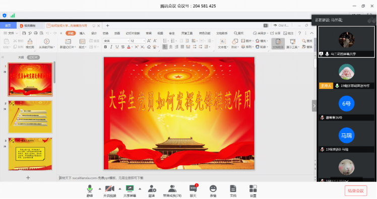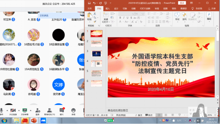 4月16日,本科生党支部开展了“防控疫情、党员先行”法制宣传线上主题党日活动,支部党员、发展对象、入党积极分子参加活动,会议由支部书记刘娇主持。