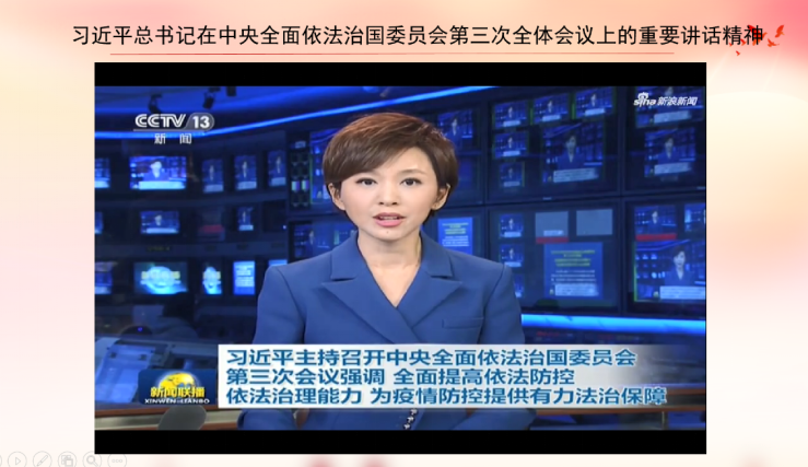 活动中,全体党员首先共同观看了习近平总书记在中央全面依法治国委员会第三次全体会议上的重要讲话精神的视频。随后,张刘倩玉同志带领大家学习了《中央全面依法治国委员会关于落实依法防控新型冠状病毒感染肺炎疫情切实保障人民群众生命健康安全的意见》精神。支部书记刘娇同志向党员、入党积极分子普及了新型冠状病毒肺炎疫情防控有关法律法规,分享了妨碍疫情防控的典型事例,号召大家深入学习疫情防控工作有关的法律知识,做知法懂法的老员工。