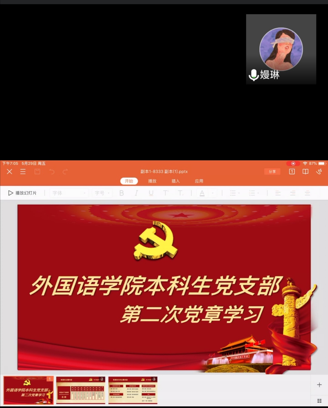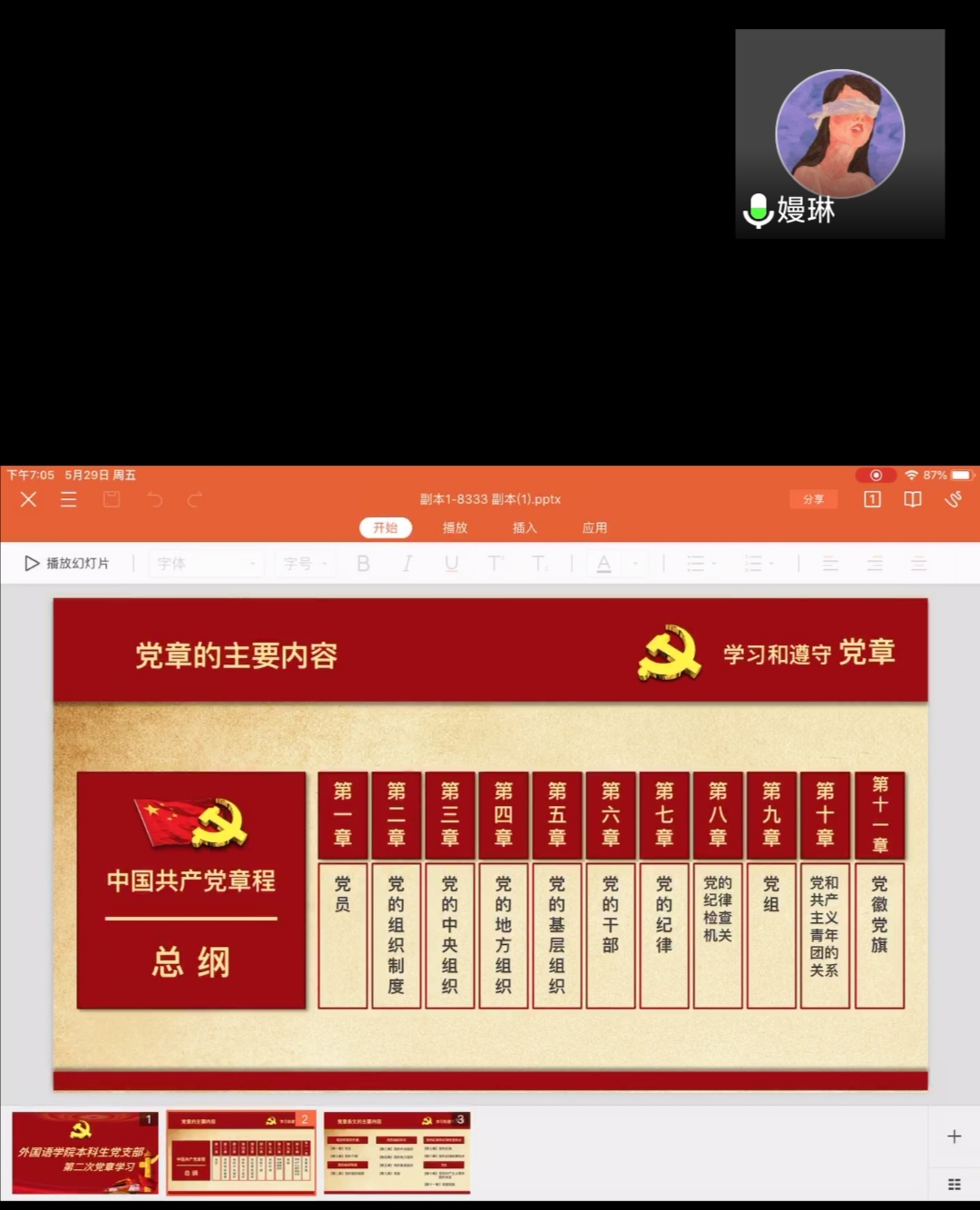 本次活动学习内容是党章的第7章至第11章,大家积极分享了党章学习的感想及经验。党章第七章主要内容是党的纪律,大家通过自主学习与重点讲解进行了学习;党章第八章是党的纪律检查机关,叶琳同志带大家学习了党的纪律检查机关具体有哪些,18翻译的孟颖同学进行了诵读学习;党章第九章是党组,张永平同志带大家进行了诵读学习,并讲解了重点内容;党章第十章是党和共产主义青年团的关系,张永平同志详细的介绍了共产主义青年团和党的关系,同时也分析了容易记忆出错的地方;党章第十一章是党徽和党旗,叶琳同志详细向大家介绍了党徽党旗的构成部分。在会议的最后,主持人对几次线上学习的情况进行了总结,学习完党章九到十一章之后,大家进行自由讨论,总结下自身的不足和接下来的学习规划,18日语的张雨佳和18翻译的才拉吉带头进行了发言。