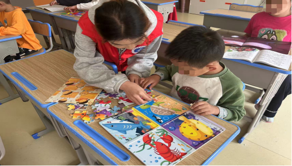 拼拼图时,我们一起完成一幅“森林小屋”的图案,最后只剩一块棕色的“木门”碎片找不到。我翻遍了桌上的碎片,甚至着急地站起身查看地面,这名孩子却始终安静地坐在一旁,手指轻轻拨弄着散落的小块。突然,他拉了拉我的袖口,掌心向上摊开,那块失踪的棕色碎片正躺在他的手心里,边缘还带着他手心的温度。他没说话,只是看着我,嘴角轻轻弯了一下,那抹笑意像颗小石子,在我心里漾开层层温暖的涟漪。原来他不是“不参与”,只是把关注藏在安静里,用最直接的方式帮我解决难题。