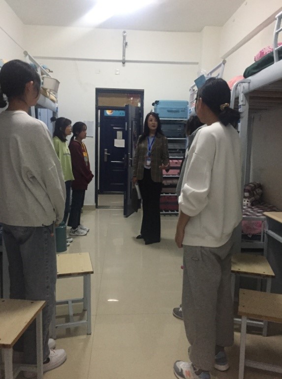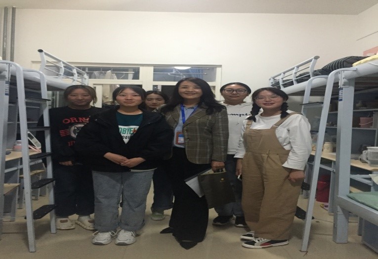 2021年9月21日,中秋佳节的晚上,公司党总支书记马金芳、辅导员殷春兰、班主任吴万贞和刘海燕走访员工宿舍。