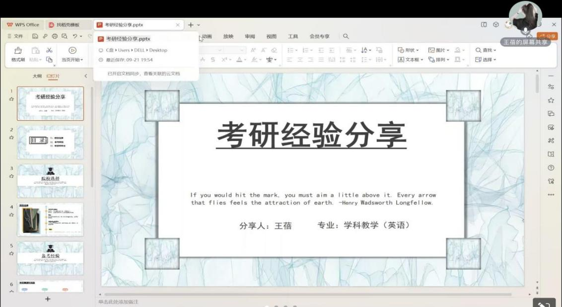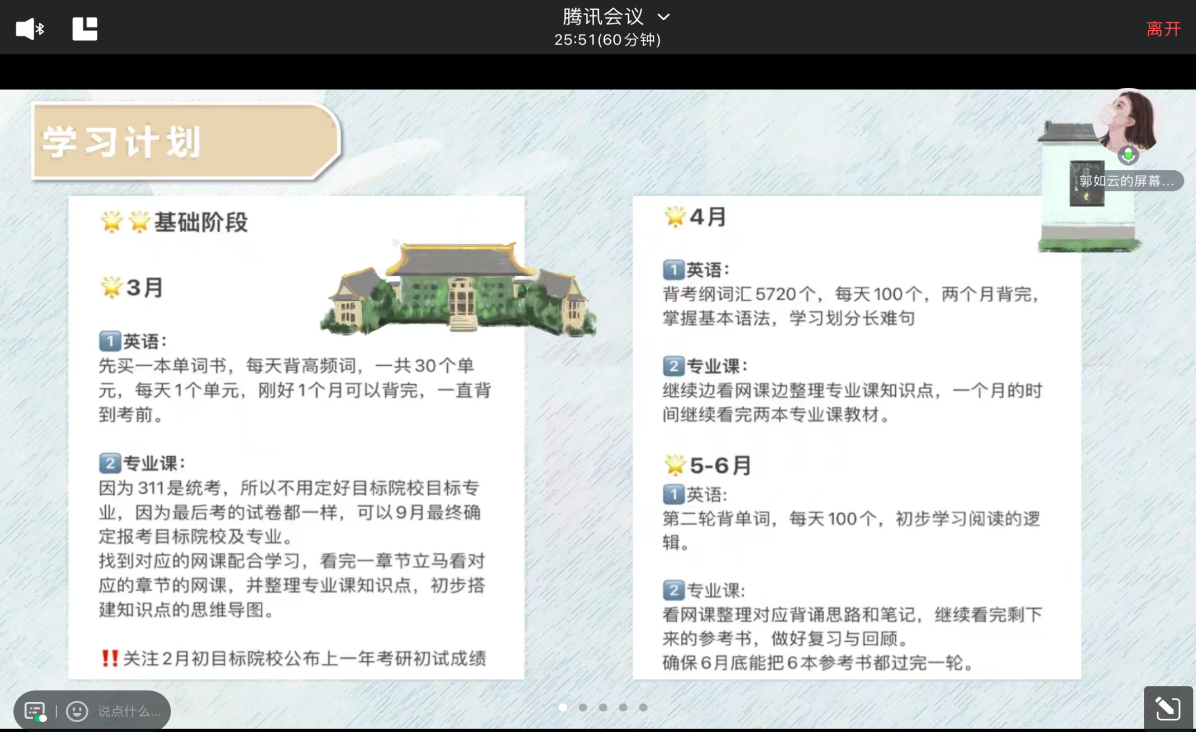 会议伊始,21级研究生郭如云同学聚焦择校和考前准备和大家分享了宝贵经验。她认为择校时要综合考虑就业意愿,职业规划和人生规划等各方面因素,快速定位自己的兴趣和能力,在确定目标公司后,有决心坚持至少一年的学习进度;关于备考,她建议同学们要有长远的备考规划,不同的阶段需要调整相应的学习模式。最后,她还强调:“考研是一场盛大的梦,是从春季开始编织的梦,是在寒冬凛冽时盛开的梦。人生的种种就在一次次选择中产生,站在现在的渡口,选择了考研,可能是梦想,也可能是随波逐流,但无论是哪一种,都是鼓足勇气所做的决定。”在郭如云学姐的鼓舞下,同学们对择校有了更为清晰的了解,也明白了有效学习的重要性,即在有限的时间如何做到事半功倍。