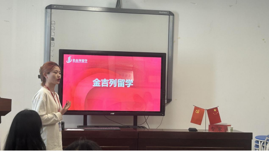 首先,辅导员巩鲜妮老师依次向大家介绍参会人员,同学们表示热烈欢迎。简单地介绍之后,巩老师向金吉列留学的几位老师介绍了我们公司的一个基本情况,包括发展历史、团队力量、专业设置等各个方面,还播放了公司宣传片,让金吉列留学的各位负责人有更深入的了解。