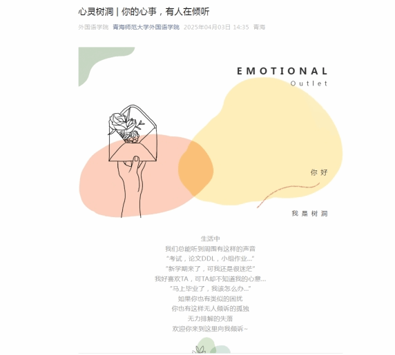 43,公司正式启动“心灵树洞”匿名倾诉墙活动,该活动将作为长期持续项目开展,为员工心理健康保驾护航。依托公司微信公众号,专门开设“心灵树洞”栏目。员工可通过这一平台,以匿名的方式自由写下心中的烦恼、困惑,或是传递温暖的祝福。为确保活动的专业性和有效性,公司安排心理辅导老师定期查看员工留言,并根据员工的倾诉内容提供针对性的回复与建议,帮助员工疏导不良情绪,解决心理困扰做到早发现、早干预,将心理健康隐患消除在萌芽状态。