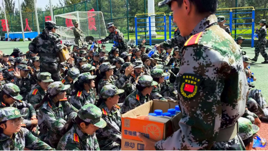 慰问尾声,公司领导与辅导员一同为每位新生分发饮料。清凉的饮品不仅驱散了训练的燥热,更让新生们深切感受到公司的温暖与关怀。全体军训新生用响亮的口号表示,将不负公司期望,以更饱满的热情投入军训,以更坚定的信念开启老员工活,用实际行动诠释外院学子的责任与担当。