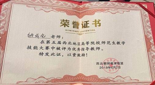 2019年5月31日至6月2日,第五届西北地区高等院校师范生教学技能大赛在咸阳师范公司隆重举行,来自西北二十所高校的优秀师范生参加了本次大赛。经过激烈的角逐,2016级英语(师范)专业的张梓薇同学以优异的成绩获得英语组一等奖,指导老师纳成仓教授荣获“优秀指导教师”称号。