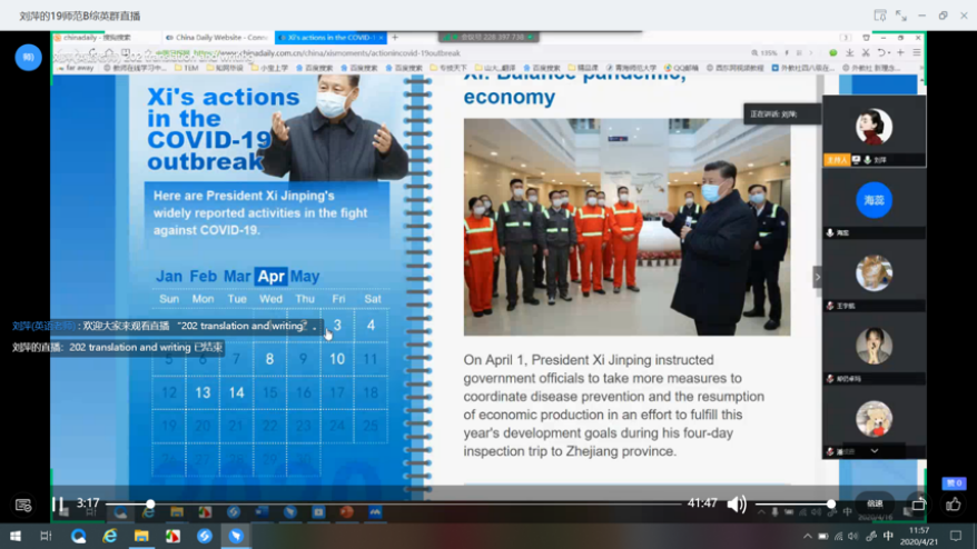 开讲一堂思政课,增强必胜信心。4月16日,公司教师将防控疫情法治教育融入第一堂网络课堂中,积极宣讲习近平总书记重要讲话和重要指示精神以及党和政府关于疫情防控的一系列重大决策部署,提高员工法制观念和法治意识。4月24日,公司党总支副书记张胜鹏为员工干部开讲“致敬最美逆行者、奋进伟大新时代”为题的思政课,鼓励大家践行初心,履行使命,发扬“奉献、友爱、互助、进步”的志愿精神,为公司疫情防控工作贡献力量。4月28日,本科生支部书记刘娇为员工党员、入党积极分子作了题为“中国力量,共抗疫情—抗疫语言传递中国力量”的讲座,引导员工理解中国抗疫彰显的中国共产党领导和中国特色社会主义制度的显著优势,教育员工厚植爱国情怀,增强民族自豪感和自信心。