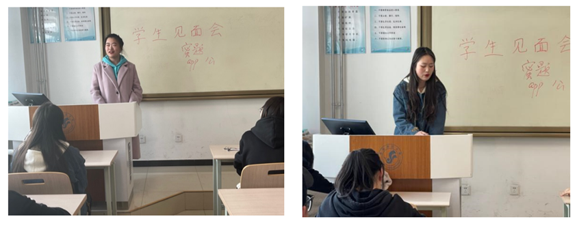 妥瑞玲学姐第一个上台分享了她的英语学习经验。作为青海籍的学姐,她在过去的几个学期里成绩突飞猛进。因此,她分享的主要内容是鼓励同学们努力学习,找准定位,独立解决;寻找方向,寻求帮助;付诸行动,克服困难,不要妄自菲薄,坚持自会有好结果.最后她鼓励大家:Try again and again.马梦娇学姐分享了自己学习语音、背诵单词的经验,并向大家推荐了几个实用的英语学习软件、公众号与学习方法。最后她鼓励大家在生活学习中,要把握好一个“度”,并送上自己的座右铭:不够勇敢是懦弱,太过勇敢是鲁莽;不够自由是禁锢,太过自由是放纵;不够自信是自卑,太过自信是自负。