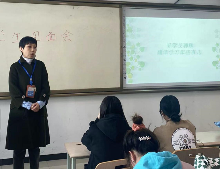 邱禹学长分享了他的翻译学习经验,向大家推荐了许多翻译专业实用的公众号和专业课书籍,介绍了大学里需要考取的一系列证书,并鼓励学弟学妹们:不是所有的努力都有收获,但每一颗汗水都有它的意义。李祥茹学姐分享了自己在阅读和听力方面的经验。她是大一下学期从旅游管理专业转入翻译专业的,但是她可以快速跟上学习进度,成绩在班里名列前茅。因此,她的学习经验有不一样的亮点。祥如学姐详细解读了进行“精听”的步骤,介绍了增加阅读量的方法。最后她鼓励学弟学妹们: 哪有什么所谓的幸运,只不过是你的努力恰巧碰到了机遇。