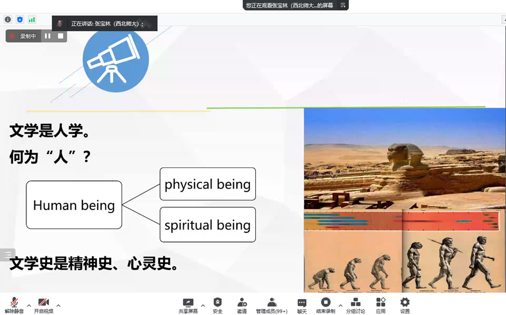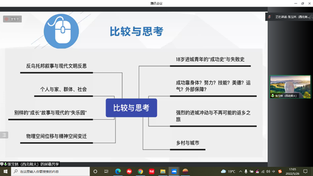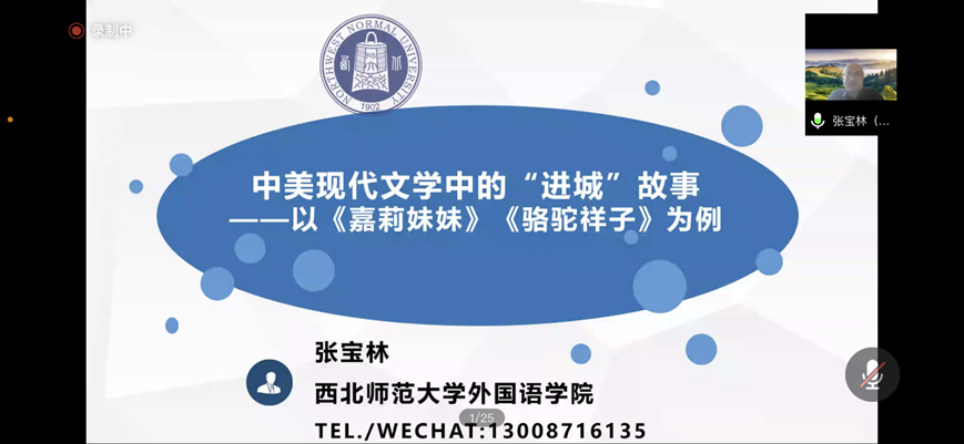 2022526日下午2:30——5:30,西北师范大学365英国上市公司张宝林教授为公司师生做了题为 “中美现代文学中的乡下人‘进城’故事”的讲座——以《嘉莉妹妹》和《骆驼祥子》为例”的讲座。张宝林教授用“文学是人学”引入,阐释文学史是精神史和心灵史。进城不仅是从农村到城市的物理空间转移,更是人自身心灵的变化。进城的原因主要是城市的吸引力和农村的推动力。城市出现,是人努力的结果,城市也在潜移默化地归训着人,这是一个双向建构过程。