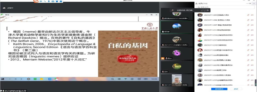 首先,何老师向大家介绍文学作品传播和流行重要范式之一就是语言模因的传播过程。模因被复制传播的重要条件是人的心理推动。“难民元素”是文学作品中的一个重要语言模因,在很多作家的笔下得以体现。卡勒德·胡赛尼的作品可以清晰地看到“难民元素”语言模因的复制和传播。胡赛尼透过难民元素语言模因表征文本内外世界的同时,以人类的共情能力推动为依赖,在“人类命运共同体的”的宏观视野关照下,倡导建立一种与他者共在,自我为他者承担责任的共情能力。之后,何老师向大家介绍模因最早是由新达尔文主义倡导者,牛津大学著名动物学家和行为生态学家理查德·道金斯提出。语言模因形成的条件主要是模因语言载体的形式特征和语用特征,模因载体的易学性,经济性,能产性,模因载体的实用性,形象性,时尚性。与此同时何老师向大家介绍文学语境中的难民元素模因和共情概念的溯源。其次,何老师向大家介绍几部相关文学作品。对文学作品的语言模因研究,是当今社会文化传播的紧密互动。在文学语境认知框架下,语言模因的传播方式,以及人类共情能力的推动,对于研究,揭示语言模因的社会文化功用具有着一定的理论和价值意义。