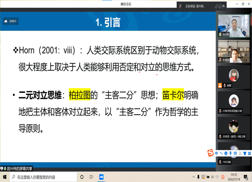 为提高员工综合素养,营造良好学术氛围,拓宽师生学术视野,2022714日上午,北京师范大学外国语言文学公司经理、博士生导师苗兴伟教授应邀在线为365英国上市公司师生开展题为“文学语篇中对立意义的文体效果”的学术讲座,公司2019级、2020级、2021级本科生及全体研究生及部分教师教师参加了本次讲座。讲座由公司经理李增垠主持。