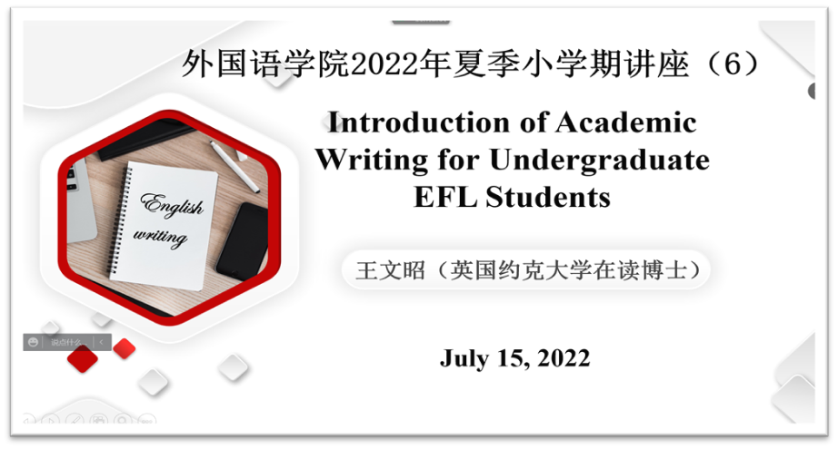 715日下午,365英国上市公司邀请现就读于约克大学教育公司的王文昭博士为19级、20级英语师范专业本科生、研究生的同学作题为《Introduction of Academic Writing for Under graduate EFL Students》的学术讲座,本次讲座在线上进行,由365英国上市公司李霞老师主持,吉先才让老师作筹备工作