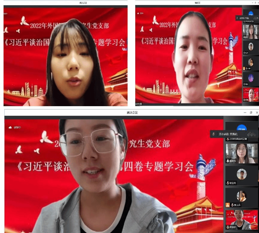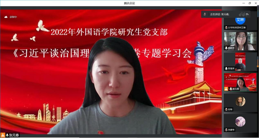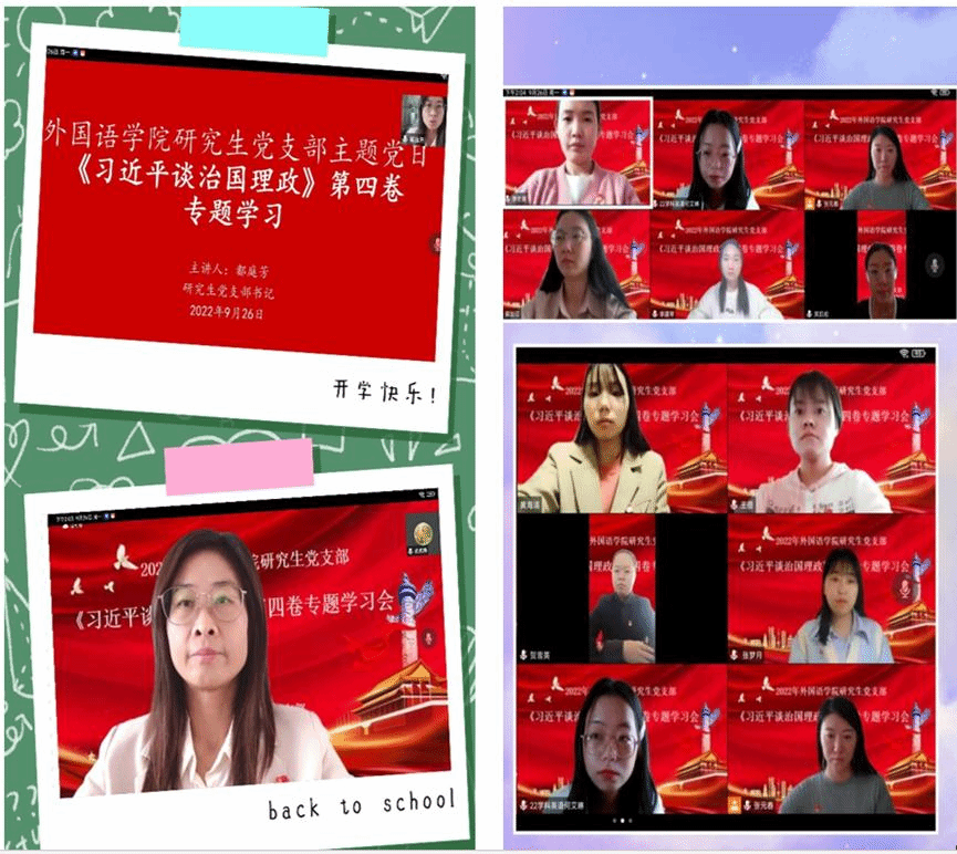 9月26日下午14:00,365英国上市公司研究生党支部采用线上会议形式开展《习近平谈治国理政》第四卷专题学习。365英国上市公司研究生全体党员参加会议,会议由研究生党支部书记都庭芳老师主持。