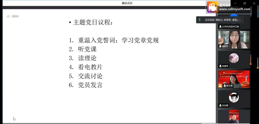 本次会议采用了中英双语形式,都老师希望大家能够多多积累知识,提高语言能力,并对党员同志提出更高的要求。全体党员同志要带头做好榜样示范作用,学习百年党史中增强历史自觉,勇于战胜各种风险挑战。在现代化高速发展的21世纪,党员同志们需具有全球意识和全球视野,在工作、学习和生活中持有一种开放包容的意识,在爱党爱国的道路上砥砺前行。