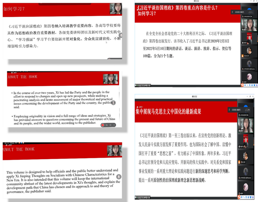 会议第二项由都老师讲解本学期第一堂党课。内容主要以中英文的双语形式详细介绍了《习近平谈治国理政》第四卷:为使国际社会了解中国、有力展示中国形象做了生动诠释,《习近平谈治国理政》集中展现了马克思主义中国化的最新成果,充分体现了党为推动构建人类命运共同体、共建美好世界做出的最新贡献,是全面系统反映习近平新时代中国特色社会主义思想的权威著作。