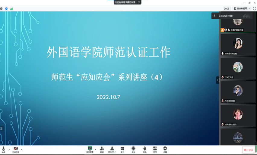 为了更好地迎接专家线上认证工作,让师范生更好地理解和掌握英语专业师范认证的相关内容,在马金芳书记的组织下,公司于2022年10月7日举行师范专业员工线上师范类认证工作“应知应会”培训会。