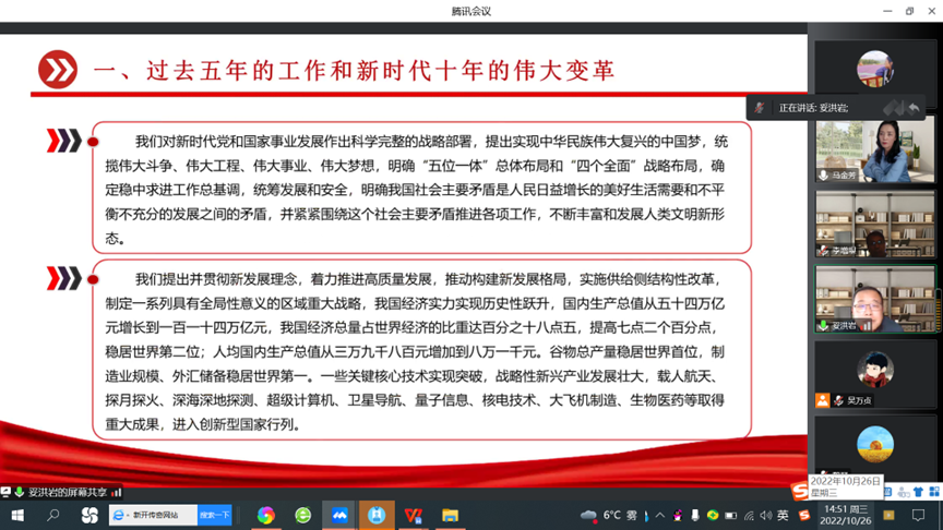 按照“5+X”主题党日要求,全体党员交纳了10月份党费、重温了入党誓词。随后妥洪岩同志领学中国共产党第二十次全国代表大会关于十九届中央委员会报告的决议;赵丽莉同志领学了中国共产党第二十次全国代表大会关于《中国共产党章程(修正案)》的决议;魏琴同志领学了中国共产党第二十次全国代表大会关于十九届中央纪律检查委员会工作报告的决议。最后,集体学习了党的二十大报告及会议精神。
