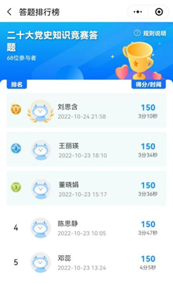 本次比赛依托线上平台,按照“竞赛答题”比赛规则,在限定时间内作答,最终以得分最高,用时最短者获胜。比赛题目涵盖了党史、新中国史、改革开放史、社会主义发展史及党的二十大报告等内容,围绕党的光辉历程、党的优良传统、习近平新时代中国特色社会主义思想等应知应会的党史知识展开,题目内容丰富、知识覆盖面广,多维度地检验了同学们的学习成果。