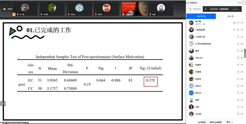 检查中,2023届硕士研究生认真报告了论文的写作情况,结合PPT图文并茂地阐述论文的选题目的、理论框架、研究问题的方法及实际意义,说明了论文的重点难点与写作进程安排。各位专家老师们对毕业论文进行逐一点评,专家老师们从论文的选题与结构、研究方法的恰当性、数据分析的有效性、写作的逻辑性和论文的规范性等方面,对毕业论文的完成情况进行了检查,并指出了存在的问题,并提出了一些建议,为硕士研究生完成毕业论文提供了很好的方法与思路。