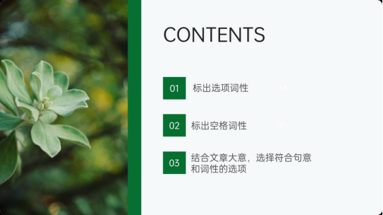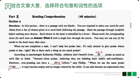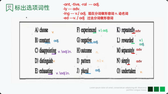一、要标出选项的词性。选项的词性可以根据构词法以及平时的词汇积累来进行判断。例如:以-ible/-able/-al/-tive/-ant结尾的单词一般为形容词;以-ly结尾的单词一般为副词,以-ing结尾的单词一般为形容词、动词或名词;以-ed结尾的一般为动词或形容词等。二、要判断并标出空格词性。三、结合文章大意,选择符合句意和词性的选项。