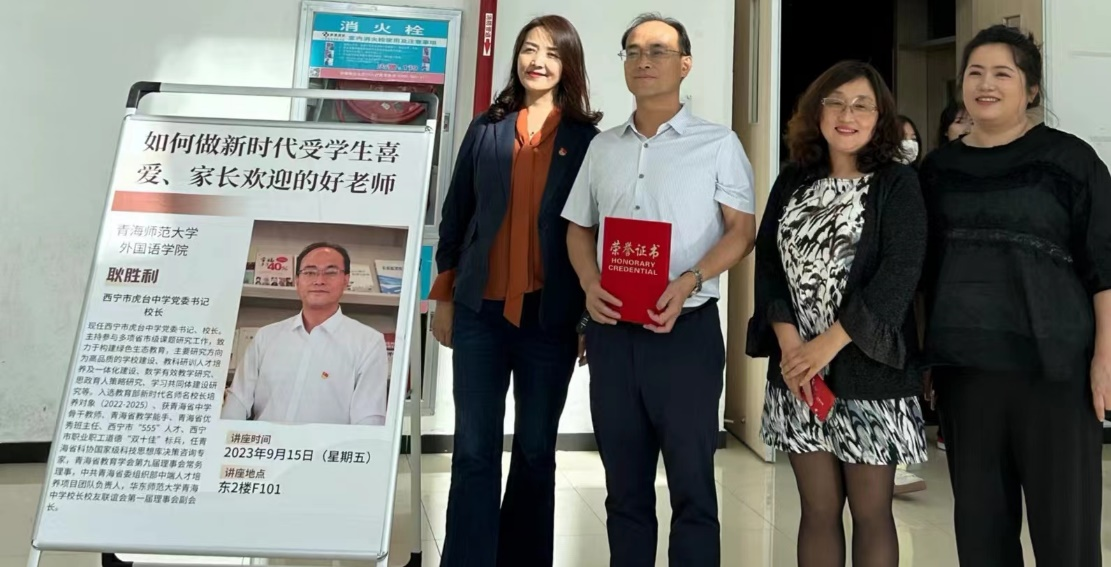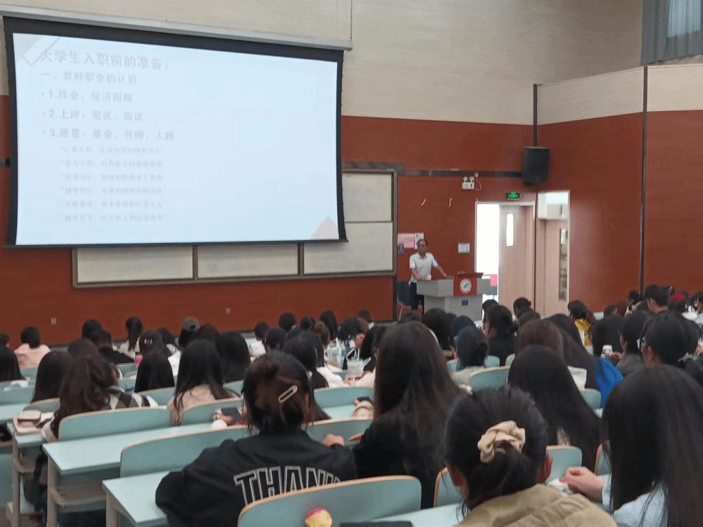 为进一步提升公司师范生教师职业素养,明确师范生发展和就业方向,公司邀请西宁市虎台中学党委书记、董事长耿胜利于2023年9月15日14:00在东二楼F101教室为公司师生开展 “如何做新时代受员工喜爱、家长欢迎的好老师”的主题讲座,公司党总支书记马金芳、学科教学教研室主任、英语师范专业负责人李霞,辅导员巩鲜妮老师和英语师范专业近200名在校员工到场聆听讲座。