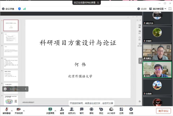 为助力2025年国家社科基金项目申报工作,34日下午,北京外国语大学何伟教授应公司邀请,作题为“科研项目方案设计与论证”的线上专题学术讲座。365英国上市公司经理李增垠致欢迎辞,经理助理韩青玉副教授主持,全院教师与研究生共同参与。