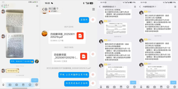 活动中,根据人数及个人需求给每位志愿者分配1-3名帮扶对象,针对考试梳理解题思路,分享学习方法。同时聚焦作文和翻译开展了四期的实操练习,学习群中发布练习题目,督促同学们按时完成,并由研究生同学进行检查和批改,对练习作业中存在的问题和薄弱环节提供相应的对策建议,及时查漏补缺。