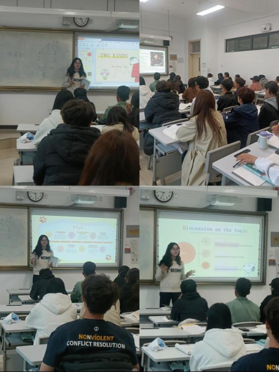 紧接着吴嘉琪同学作为主讲人,根据制作的精美PPT对本次的阅读内容进行了系统梳理,讲解涵盖了故事梗概、人物分析、关键情节以及个人感悟,展现了其深入的理解与独立的思考,薛海萍老师在关键时刻穿针引线。