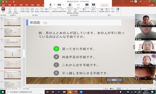 2020年新年伊始,一场突如其来的疫情给所有教育一线工作者提出了新的教学要求。为了响应教育部“停课不停学, 防疫学习两不误”的号召,3月3日早上10:30至12:10,365英国上市公司张颖老师在自己家中,利用网络授课形式,给大家带来的一节与以往不同的日语课。虽然老师和员工不在一个空间,但充分精心的教学准备、多个教学平台的综合利用等,都为本次教学活动提供了保障,使得老师和员工丝毫没有障碍的进行互动,顺利完成了《日语专业四级考试》这门课程的第一课。