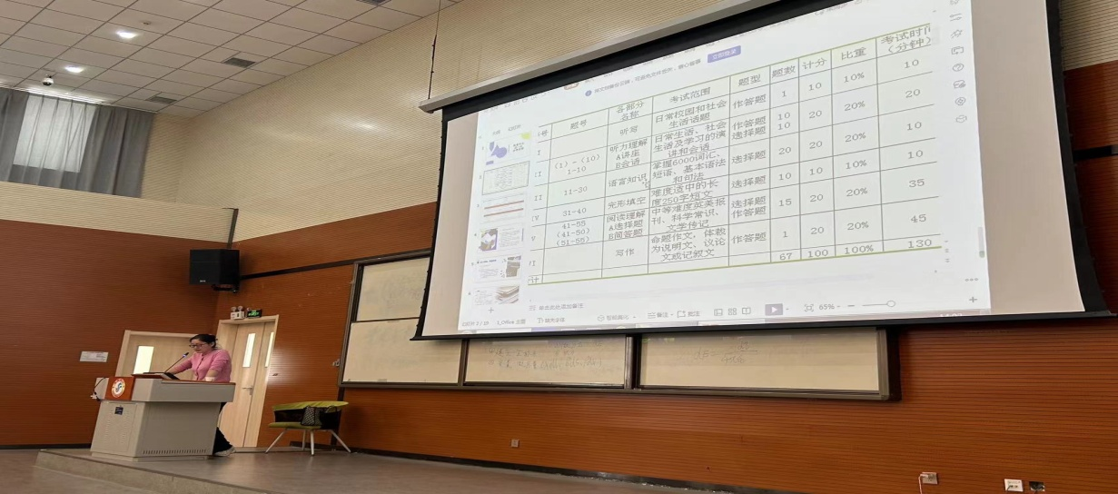 首先,负责专四专八考务工作的刘萍老师各个题型的全国平均分、院平均分的数据进行了对比,旨在找出差距和薄弱环节,以次敦促员工们在学习中要有针对性的练习。此次,刘老师从考试时间该如何分配、专四专八考察范围、如何备考几个方面进行解析,尤其强调专四的听力部分和专八的阅读理解部分,是公司员工最为薄弱的地方,平时更要加强这方面的专项训练。