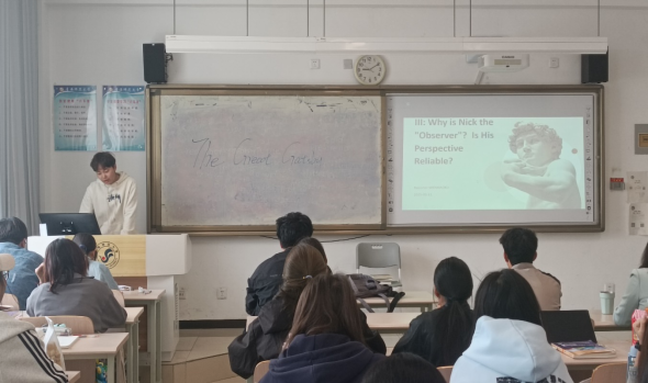 为激发同学们的阅读兴趣,促进深度思考,帮助同学们从不同角度解读文本,提升批判性思维,推动知识的内化和实践, 51224级英语C班举办了关于The Great Gatsby的读书分享会。同学们分为六组,对以下主题进行了分析和讨论。