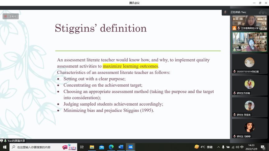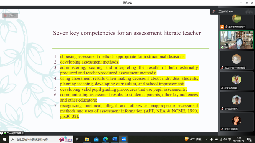 接着,姚雯静博士分享了由美国教师联盟(AFT)、全国教育协会(NEA)及国家教育计量委员会(NCME)共同起草的教师评测能力标准(The Standards)中对“Assessment”的定义,评估是一个获取信息的过程,更够给予员工有效的反馈,可以评判教学效果,是服务于员工学习和教师教学的工具。紧接着,姚博士分享了具有良好的测评素质的教师必备的七项能力,比如教师要学会选择适合教学决策的评估方式,制定评估的方式,以及要认识到一些评估方式和评估信息的使用是不恰当的等。姚博士同时也展示了学者Stigginsassessment的定义,他认为评估活动的实施的目的是使员工学习成果最大化,一个良好的评测素质的教师要明确自己的评测目标,根据员工的现实特点,选择合适的评测方法。姚博士提到,教师需要认识到,任何具有高信度与效度的测评方式,仍具有一定的局限。随后,姚雯静博士展示了评估的类型和形式,评估主要分为形成性评估(Formative assessment)和终结性评估(Summative assessment),两种评估发生的时间不同,目的不同,呈现的方式也不。我们要认识到测评的四大目的,根据Taylor提出的语言测试的原则及Fulcher提出语言评估素养,姚博士认为,作为外语教师,我们要把语言教学法(language pedagogy)放到更高的地位,课堂中开展的课堂活动与学习结束后的测评一样重要,教师一定要认识到测评的最终目的是为了员工最大化他的学习效果。