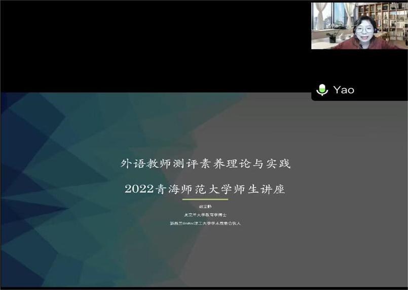 129日下午,应公司邀请,新西兰奥克兰大学教育学博士、新西兰Unitec理工大学学术质量合伙人姚雯静博士为公司广大学子做题为“外语教师测评素养理论与实践”的线上学术讲座,讲座由王芳博士主持。
