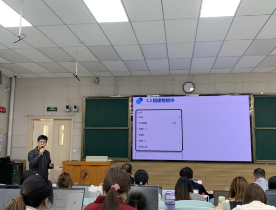 讲座后半段聚焦实操,王老师演示了在扣子平台搭建专业翻译智能体的流程,详解知识库、记忆库与工作流设计的关键要点,以及如何创建属于自己独特的数据库,并结合教学、翻译竞赛案例,探讨了智能体在课程建设、教材开发、产学研协同中的价值转化路径。讲座尾声,王老师与在场师生就翻译技术的应用前景等话题进行了互动交流。