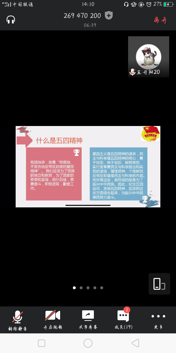 本次主题团学中,各班通过各类新颖、充实、生动的形式,向大家发出了”传承五四精神,让青春在新时代绽放“的号召,各团支书带领同学们重温了入党誓词、学习了团歌。18翻译,18日语等班级通过腾讯会议的线上方式开展团学,大家争先恐后发表自己的观点,例如如何发扬五四精神、如何成为更好的自己、如何成为时代新人等。讨论中,每个人都把“爱国,进步,民主,科学”的五四精神深深的印在了脑海里,这种精神会一直陪伴着同学们,在未来的人生路上助力远航。17翻译,19师范B班等班级通过线下形式开展了团学活动,在班级里的同学通过讨论、交流的方式开展团学,虽然带着口罩,但通过眼神依然可以看见他们对知识的渴望,在五四精神的学习中,每个人都获益匪浅,在团支书的带领学习下,我们每一位同学都有了自己的小目标,为成为时代新人而努力奋斗。