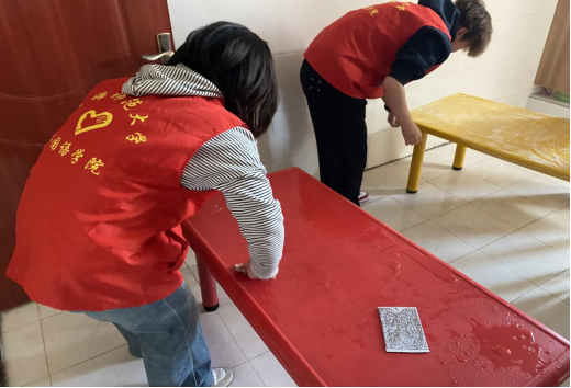 教室里,志愿者们弯腰拖地、擦拭桌椅。地面上的每一处污渍都被反复清理,桌椅的每一个角落都被仔细消毒。为了让孩子们拥有更明亮的学习环境,窗台和玻璃也被擦拭得一尘不染。整理物品时,大家轻拿轻放,将孩子们的手工作品和教具摆放得整整齐齐。