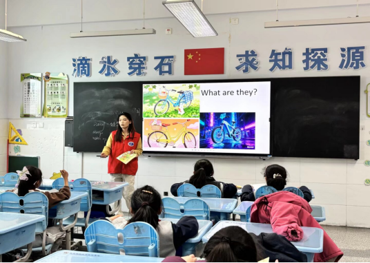 1.具体内容:志愿者以《Monkeys Big Bike》绘本封面为切入点,通过展示Monkey的大自行车、Little Teddy的小自行车等童趣画面,自然引出bike”“big”“little”等核心生词。为了让低年级员工更好地理解记忆,志愿者设计了“单词动作操”:说到“big”时张开双臂比出宽大的动作;说到“little”时用手指比出小巧的样子;说到“bike”时模仿骑车的姿势,用肢体联动加深词汇印象。
