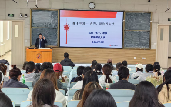 武波教授首先从哲学观、道德观、集体观、生死观、共情观五个方面,展现了中华文化深刻的时代内涵,通过梳理中华古典文化发展的思想脉络,不仅对我国的经典著作作了阐发性介绍,还对当代老员工应该如何传承中华璀璨的文化,如何做人做事作了积极引导。武教授就“道法自然”“中庸之道”等经典词句的内涵和译法,引经据典,提出了自己独到的观点,同时点明中华文化可持续的本质和奥秘在于道统、和合和礼教。他详细阐释了中国文化外译中要注意的原则:“有所译,有所不译”、“译随境变”、“最大公约,最佳对称”;武教授强调,翻译中国要遵循“迻文译化大翻译”和“原汁原味、异化优先”的指导原则,讲座内容给在场师生带来诸多启发。